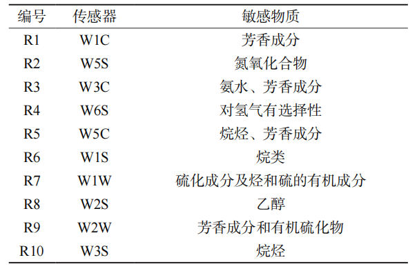 電子鼻配制傳感器對不同類型化合物響應(yīng)如表 2。
