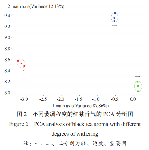 對不同萎凋程度的紅茶進(jìn)行 PCA 分析(圖 2),得出第一主成分的貢獻(xiàn)率 87.860%,第二主成分貢獻(xiàn)率為 12.134%,總貢獻(xiàn)率為99.994%。主成分分析(PCA)就是對多指標(biāo)的高維數(shù)據(jù)進(jìn)行降維,提取數(shù)據(jù)中反應(yīng)最大的幾個(gè)特征值對應(yīng)的特征向量作為主成份,貢獻(xiàn)率越大, 說明該主成分在數(shù)據(jù)信息中越重要,越能最大限度地反映樣本最原始的信息。由圖 2 可知,不同萎凋程度的紅茶香氣成分在類別和含量上有了較大的變化,其中重萎凋在第一、第二主成分上明顯區(qū)別于輕萎凋和適度萎凋,表明重萎凋的工藝使紅茶香氣成分在類別和含量上發(fā)生了較為明顯的變化;輕萎凋和適度萎凋在第一主成分上差異不明顯。整體來說,萎凋程度不同,使紅茶香氣的成分表現(xiàn)出明顯的差異??芍獏^(qū)分度值越趨近于 1,表明兩種物質(zhì)差異越明顯。表4中區(qū)分值都在99%以上,表明 PCA 可以將不同萎凋程度的紅茶區(qū)分開。