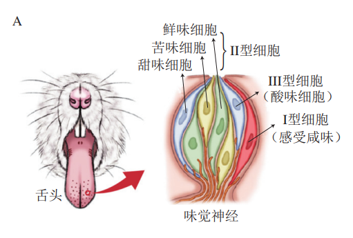 味蕾是人體的味覺感受器,其超微結(jié)構(gòu)含有多種味覺細(xì)胞,負(fù)責(zé)感受甜、苦、咸、酸和鮮等風(fēng)味,在味覺感知的過(guò)程中起關(guān)鍵作用。味蕾的超微結(jié)構(gòu)如圖1A所示,苦、甜和鮮味刺激由II型細(xì)胞檢測(cè),酸味刺激由III型細(xì)胞檢測(cè),而檢測(cè)咸味刺激的味蕾細(xì)胞尚未明確,Chandrashekar等通過(guò)對(duì)嚙齒類動(dòng)物味覺細(xì)胞的研究發(fā)現(xiàn),咸味的感知主要與I型類膠質(zhì)細(xì)胞有關(guān)。咸味的感知途徑為刺激物作用于味覺細(xì)胞的頂端致使細(xì)胞膜發(fā)生去極化,產(chǎn)生動(dòng)作電位,從而釋放神經(jīng)遞質(zhì)并發(fā)生傳遞,最終傳入神經(jīng)反饋大腦。刺激物的不同,所引導(dǎo)的感知與傳遞不同。目前常見的咸味刺激物主要是以NaCl為主的金屬鹽類,但隨著研究的不斷深入,非金屬離子的咸味刺激物不斷涌現(xiàn)。非金屬離子類刺激物非金屬離子的咸味刺激物以氨基酸、核苷酸和小分子多肽為代表,其涉及受體和咸味傳導(dǎo)途徑復(fù)雜。