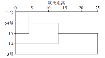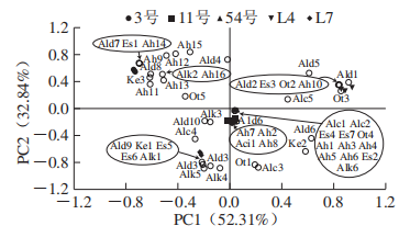 式中:Cri、Ti分別為各揮發(fā)性化合物的相對(duì)含量/%和氣味閾值/(μg/kg);Crstan、Tstan分別為對(duì)樣品風(fēng)味貢獻(xiàn)最大組分的相對(duì)含量/%和氣味閾值/(μg/kg)。 ROAV≥1的物質(zhì)為該品種金針菇的特征揮發(fā)性物質(zhì);0.1≤ROAV<1的物質(zhì)對(duì)該品種金針菇整體風(fēng)味有修飾作用,且ROAV越大說(shuō)明該物質(zhì)對(duì)該品種樣品總體風(fēng)味貢獻(xiàn)越大。 不同品種金針菇揮發(fā)性物質(zhì)的SPME-GC-MS分析 如表1所示,5個(gè)品種金針菇樣品中共檢測(cè)出53種揮發(fā)性成分,3號(hào)、11號(hào)、54號(hào)、L4和L7分別檢測(cè)出21、29、21、12種和18種成分,其中醇類、醛類和芳香烴類占總含量的60%~95%。不同品種金針菇僅有2種共有揮發(fā)性成分,分別為1-己醇和2-十一烷酮。每種金針菇都有3種或3種以上其他品種中不存在的化合物,3號(hào)、11號(hào)、54號(hào)、L4和L7中特有化合物數(shù)量分別為3、12、3、4種和4種。 表1 不同品種金針菇樣品中揮發(fā)性化合物的相對(duì)含量 如表2所示,辛醛、苯乙醛、壬醛、癸醛、2-十一烷酮、2-甲基丁酸甲酯、D-檸檬烯為3號(hào)金針菇的特征揮發(fā)性物質(zhì)(ROAV≥1),香葉基丙酮對(duì)3號(hào)金針菇的整體風(fēng)味起修飾作用(0.1≤ROAV<1);1-己醇、反式-2-庚烯醛、辛醛、反式-2-辛烯醛、壬醛、2-十一烷酮、香葉基丙酮、2-正戊基呋喃、D-檸檬烯為11號(hào)金針菇的特征揮發(fā)性物質(zhì)(ROAV≥1),1-庚醇、1-辛醇對(duì)11號(hào)金針菇的整體風(fēng)味起修飾作用(0.1≤ROAV<1);1-壬醇、辛醛、壬醛、癸醛、2-十一烷酮、D-檸檬烯為54號(hào)金針菇的特征揮發(fā)性物質(zhì)(ROAV≥1),1-辛醇、反式-2-庚烯醛對(duì)54號(hào)金針菇的整體風(fēng)味起修飾作用(0.1≤ROAV<1);1-壬醇、庚醛、辛醛、反式-2-辛烯醛、癸醛、2-十一烷酮、2-正戊基呋喃為L(zhǎng)4金針菇的特征揮發(fā)性物質(zhì)(ROAV≥1),1-己醇對(duì)L4金針菇的整體風(fēng)味起修飾作用(0.1≤ROAV<1);反式-2-辛烯醛、反,反-2,4-癸二烯醛、癸醛、2-十一烷酮為L(zhǎng)7金針菇的特征揮發(fā)性物質(zhì)(ROAV≥1),1-己醇、1-辛醇、反式-2-庚烯醛對(duì)L7金針菇的整體風(fēng)味起修飾作用(0.1≤ROAV<1)。 5種金針菇中共檢測(cè)出5種醇類化合物,存在于4個(gè)品種金針菇中的1種,是1-辛醇,1-庚醇和1-戊醇均只在11號(hào)金針菇中被檢測(cè)到。 5種金針菇中共檢測(cè)出10種醛類化合物,在4種金針菇中被檢測(cè)到的有3種,分別為己醛、辛醛和癸醛,庚醛、苯乙醛和反,反-2,4-癸二烯醛分別是L4、3號(hào)和L7金針菇中特有化合物。酸類化合物只在54號(hào)金針菇中被檢測(cè)到,5種金針菇中共檢測(cè)出7種酯類化合物。其中只有鄰苯二甲酸二異丁酯存在于2種金針菇中,其他6種化合物均屬于特有化合物。5種金針菇中共檢測(cè)出3種酮類化合物,共有的1種,為2-十一烷酮。 5種金針菇中共檢測(cè)出6種烷烴類化合物,特有化合物2種,分別為壬烷和2,6,10,14-四甲基十六烷。 5種金針菇中共檢測(cè)出5種其他類化合物,獨(dú)有化合物有2種,分別為2-甲基-2-(1-甲基乙基)環(huán)氧乙烷和4,5,6,7-四氫-3,6-二甲基-苯并呋喃。 表2 不同品種金針菇樣品中揮發(fā)性成分及對(duì)應(yīng)的ROAV 為了顯示5個(gè)品種金針菇樣品組中53種揮發(fā)性成分的差異,使用PCA對(duì)SPME-GC-MS進(jìn)行分析。如圖1所示,前2個(gè)主要成分的貢獻(xiàn)率是85.15%;PC1占52.31%,PC2占32.84%。PC1和PC2都明確區(qū)分了不同品種,5個(gè)樣本組相互之間很好地分開(kāi),說(shuō)明不同品種金針菇間揮發(fā)性風(fēng)味相互獨(dú)立,且這2個(gè)主成分可代表樣品風(fēng)味的主要特征。所有的揮發(fā)組分根據(jù)不同品種樣品組也同樣明顯地區(qū)分開(kāi),其中,54號(hào)金針菇樣品組與12種化合物分布重疊,11號(hào)金針菇樣品組與4種化合物分布重疊。而其他3個(gè)品種樣品組雖然沒(méi)有與化合物重疊,但四周都有各自相關(guān)的化合物。然而還是有很多比較分散的化合物,處于不同品種之間。這表明盡管使用53種揮發(fā)性化合物也可以將品種區(qū)分開(kāi),但是金針菇的揮發(fā)性風(fēng)味物質(zhì)較復(fù)雜,并且在不同品種中有許多相似的物質(zhì),因此僅用SPME-GC-MS判別不同品種金針菇風(fēng)味較為局限。 圖1 不同品種金針菇樣品基于SPME-GC-MS的PCA 為了進(jìn)一步分析SPME-GC-MS對(duì)于不同品種金針菇揮發(fā)性風(fēng)味成分區(qū)分情況,將SPME-GC-MS數(shù)據(jù)進(jìn)行HCA,結(jié)果如圖2所示。從圖2可以看出,不同品種金針菇揮發(fā)性成分的聚類樹(shù)狀圖顯示出3個(gè)主要類別。其中,11號(hào)、54號(hào)和L7的樣品被歸為一類,而L4和3號(hào)的樣本被分別歸為其余兩類。在第一大類中,11號(hào)和54號(hào)的樣品在最小距離水平上首先聚類,這說(shuō)明二者的樣品揮發(fā)性成分相似度很高。隨著歐式距離的增加,L7的樣品也并入到這一類中。而當(dāng)歐式距離增加至13時(shí),L4與11號(hào),54號(hào)和L7的樣品歸為一類。隨著歐式距離的繼續(xù)增大,當(dāng)增至25時(shí),三大類才歸為一類。這與2.1.2節(jié)結(jié)果一致。HCA差異主要由不同品種中各類化合物種類和含量不同造成。結(jié)合表1可知,由于醇類、醛類和芳香烴類物質(zhì)占所檢測(cè)總物質(zhì)的60%~95%,因此影響樣品聚類的主要因素