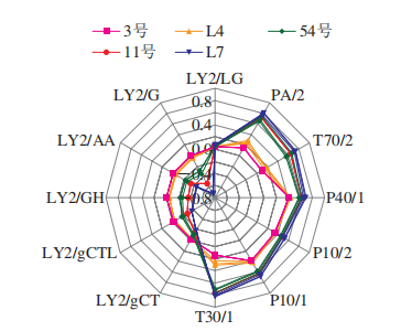 金針菇品種繁多,并且各種新品種不斷研發(fā)栽培。不同品種金針菇的生長(zhǎng)特性、出菇特性、商品性狀和生物轉(zhuǎn)化率不同,而風(fēng)味物質(zhì)也存在各自的差別和獨(dú)特之處。本研究采用SPME-GC-MS和電子鼻分析5個(gè)品種金針菇揮發(fā)性物質(zhì),由定量分析、PCA、HCA探究不同品種金針菇揮發(fā)性物質(zhì)差異,并通過(guò)SPME-GC-MS結(jié)合電子鼻進(jìn)行PCA對(duì)比品種鑒定準(zhǔn)確率。 5個(gè)金針菇樣品組(3號(hào)、11號(hào)、54號(hào)、L4和L7),測(cè)定前將樣品用液氮研磨。 GC-MS聯(lián)用儀;FOX3000型電子鼻。 金針菇風(fēng)味化合物SPME-GC-MS檢測(cè) 用液氮研磨后,準(zhǔn)確地稱量2.0g金針菇樣品于20mL頂空瓶中。將DVB/CAR/PDMS型萃取頭在250℃活化20min后,在60℃水浴中進(jìn)行靜態(tài)吸附萃取40min,將萃取頭放入GC進(jìn)樣口解吸。 以正構(gòu)烷烴的實(shí)際測(cè)量值校正保留時(shí)間,SPME-GC-MS測(cè)定結(jié)果通過(guò)NIST98數(shù)據(jù)庫(kù)(NIST08,華盛頓特區(qū))進(jìn)行檢索,取匹配度80%以上的揮發(fā)性成分;以2-氯苯甲醛為內(nèi)標(biāo)物對(duì)各化合物進(jìn)行定量分析。 用液氮研磨后,精確稱取2.0g金針菇樣品于20mL頂空瓶?jī)?nèi)。樣品測(cè)量流速150mL/min,檢測(cè)時(shí)間120s。電子鼻配備12個(gè)不同的氣體傳感器:LY2/LG、LY2/G、LY2/AA、LY2/GH、LY2/gCTL、LY2/gCT、T30/1、P10/1、P10/2、P40/1、T70/2和PA/2,通過(guò)傳感器陣列響應(yīng)和模式識(shí)別技術(shù)對(duì)揮發(fā)性氣體分子進(jìn)行分析。 特征揮發(fā)性物質(zhì)的評(píng)定 利用相對(duì)氣味活度值(relativeodoractivityvalue,ROAV)評(píng)定各揮發(fā)性化合物對(duì)樣品總體氣味的貢獻(xiàn),定義對(duì)樣品風(fēng)味貢獻(xiàn)最大的組分:ROAVstan=100,則其他揮發(fā)性化合物的ROAV小于100,按下式計(jì)算: