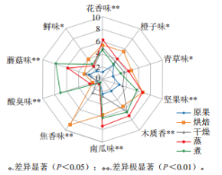 10種描述詞被選取用于5種處理后沙棗的感官評(píng)價(jià):花香、橙子味、青草味、堅(jiān)果味、木質(zhì)香、南瓜味、焦香味、酸臭味、蘑菇味、鮮味,根據(jù)描述繪制風(fēng)味輪廓圖,結(jié)果如圖3所示。不同方式預(yù)處理后的沙棗在所有感官屬性上的香氣強(qiáng)度均存在顯著差異(0.01<P<0.05),其中花香味、堅(jiān)果味、木質(zhì)香、南瓜味、焦香味、酸臭味和蘑菇味這幾種感官屬性存在極顯著差異(P<0.01)。