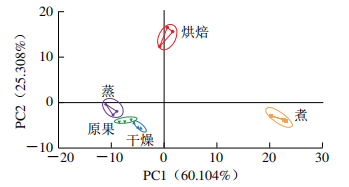 主成分分析(PCA)不僅能降低原始數(shù)據(jù)的維度還可以保留分開樣本的可變性。由圖5可知,PC1、PC2的貢獻(xiàn)率分別為60.1%和25.3%,累計(jì)方差貢獻(xiàn)率為85.4%(>85%),表明其可以有效反映原始數(shù)據(jù)的整體信息。烘焙和煮處理后的沙棗樣品位于PC1的負(fù)半軸,表明這烘焙、煮2類處理方式在PC1上差異明顯。原果、蒸、干燥處理后沙棗樣品在正半軸PC2上,烘焙和其他處理的沙棗樣品得到了較好的分離,其他4種處理方式位置區(qū)域接近,結(jié)果表明這4種預(yù)處理方式相互之間或許具有一些的相似之處。各樣品組別相互離散、無交叉,說明PCA能夠?qū)⒉煌绞筋A(yù)處理后的沙棗有效的區(qū)分開。因此,可以得出各個(gè)樣品組之間可通過電子鼻區(qū)分開并相互獨(dú)立,不同處理方式可以在不同程度上改變其沙棗的香氣成分。