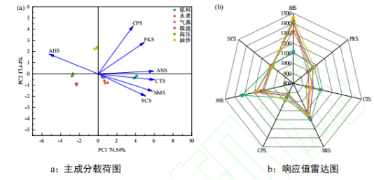 為比較不同烹飪方式對(duì)芫根整體滋味的影響,對(duì)樣品進(jìn)行電子舌分析,結(jié)果如圖3所示。電子舌主成分分析中,第一主成分(PC1)和第二主成分(PC2)的貢獻(xiàn)率分別為74.54%和17.44%,總貢獻(xiàn)率達(dá)91.98%,已超過85%,說明這兩個(gè)主成分涵蓋了絕大多數(shù)樣品信息,可以用來表征芫根的滋味特征。主成分載荷圖中,以散點(diǎn)代表各個(gè)樣品,距離越近,表明樣本滋味相似度越高,對(duì)主成分貢獻(xiàn)大的影響因子以射線形式表示出來,影響因子越靠近樣品表明對(duì)相應(yīng)樣品影響越大。6種芫根樣品分散區(qū)域明顯,表明電子舌能夠較好的區(qū)分不同烹飪方式的芫根。新鮮芫根與其他5種芫根樣品距離較遠(yuǎn),ANS和CTS傳感器對(duì)其影響較大,其中CTS傳感器對(duì)咸味具有特敏性,結(jié)合圖3b可知,新鮮芫根在ANS和鮮味特敏傳感器NMS上響應(yīng)值較高,在咸味CTS和酸味AHS傳感器上響應(yīng)值次之,烹飪后,鮮味NMS傳感器響應(yīng)值減弱,咸味CTS響應(yīng)值也明顯降低,酸味AHS響應(yīng)值增強(qiáng),說明烹飪處理會(huì)減弱芫根本身的咸鮮味,突出酸味。油炒的芫根整體響應(yīng)值較大,與其他樣品距離較遠(yuǎn),說明油炒的與其他烹飪處理的芫根整體滋味差異較大,一方面是因?yàn)橛统礈囟容^高導(dǎo)致,另一方面食用油也會(huì)對(duì)芫根滋味產(chǎn)生影響。水煮和氣蒸的芫根在主成分圖中距離較近,說明這兩種方式烹飪的芫根整體滋味相似;同理可得微波和高壓烹飪的芫根滋味相似。