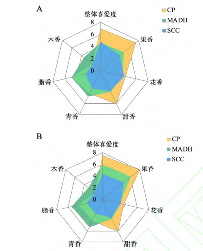 圖1 甜橙精油感官分析結(jié)果:(A)血橙精油;(B)臍橙精油
