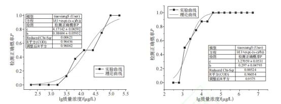 以香氣物質(zhì)濃度(μg/L)的對(duì)數(shù)值為橫坐標(biāo),測(cè)試概率P為縱坐標(biāo),建立直角坐標(biāo)系,用S曲線P=1/(1+e^(-(x-c)/b))進(jìn)行擬合,其中c為香氣物質(zhì)嗅覺閾值,b為斜率。得到實(shí)驗(yàn)曲線與擬合曲線。如圖1。