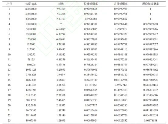 P=0.5時(shí)的檸檬烯+月桂烯混合物的濃度為檢測(cè)閾值。其檢測(cè)閾值為8544.17μg/L。