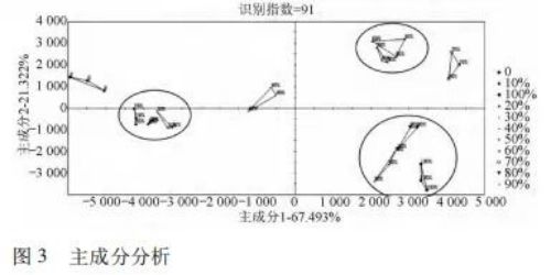 PCA是將所得的數(shù)據(jù)進(jìn)行降維,提取幾個(gè)特征值較大能反映樣本信息變量的因子進(jìn)行線性分類(lèi),以得到具有不同氣味區(qū)域和簇的描述性圖表。在經(jīng)過(guò)超快速氣相電子鼻檢測(cè)得到不同調(diào)配比例金銀花粉末的色譜峰面積以及峰數(shù)量后,篩選出區(qū)分能力強(qiáng)(>0.900)且峰面積較大(range>1000)分離效果較好的色譜峰作為傳感器,進(jìn)行PCA分析,得出主成分1與主成分2累計(jì)貢獻(xiàn)率88.815%,能夠較好地反映所測(cè)樣品中氣味信息。識(shí)別指數(shù)91,說(shuō)明超快速氣相電子鼻可有效區(qū)分不同調(diào)配比例金銀花粉末,見(jiàn)圖3。此外,10%~20%,20%~30%,50%~60%,80%~90%,90%~100%間區(qū)分較為困難。據(jù)此,可將不同調(diào)配比例金銀花粉末可分為6類(lèi),即①0;②10%,20%,30%;③40%;④50%,60%;⑤70%;⑥80%,90%,100%。