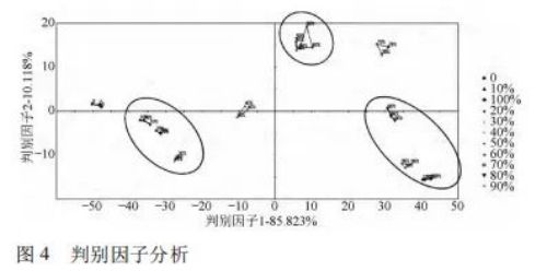 DFA是在主成分分析的基礎(chǔ)上,縮短組內(nèi)樣品間距離,增大組間差距。因此,本研究以主成分分析中所采用的傳感器,進(jìn)行判別因子分析,結(jié)果見(jiàn)圖4。由此可知,各調(diào)配比例的金銀花粉末可通過(guò)超快速氣相電子鼻進(jìn)行快速鑒別,而且區(qū)分效果較好,所得趨勢(shì)及結(jié)果與主成分分析基本相同,使PCA結(jié)果得到進(jìn)一步驗(yàn)證。