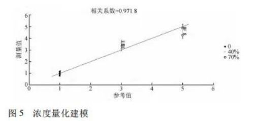 濃度量化建模采用的方法為偏最小二乘法(PLS),可使色譜圖數(shù)據(jù)與濃度值間建立線性關(guān)系,起到對(duì)未知樣品濃度進(jìn)行預(yù)測(cè)的作用。本實(shí)驗(yàn)中采用預(yù)先調(diào)配的金銀花粉末,將摻入完全開(kāi)花粉末比例設(shè)為濃度,即濃度量化建模中的因變量,以所測(cè)得氣相色譜圖數(shù)據(jù)作為自變量,進(jìn)行濃度量化建模。為實(shí)現(xiàn)較好的鑒別結(jié)果,將PCA及DFA組間區(qū)分較為良好的0,40%,70%完全開(kāi)花金銀花粉末摻入比例作為節(jié)點(diǎn),并將0,40%,70%濃度分別設(shè)為1,3,5,進(jìn)行濃度量化建模,所得結(jié)果見(jiàn)圖5,相關(guān)系數(shù)為0.9718。建模后,將10%,20%,30%,50%,60%,80%,90%,100%的原始色譜數(shù)據(jù)進(jìn)行投影驗(yàn)證,可得到較好的濃度預(yù)測(cè)結(jié)果,模型良好。另外,根據(jù)此模型,可實(shí)現(xiàn)基于摻入完全開(kāi)花金銀花粉末比例的質(zhì)量分級(jí),即濃度預(yù)測(cè)結(jié)果小于3,為金銀花粉末中摻入完全開(kāi)花粉末量低于40%,列為一等;濃度預(yù)測(cè)結(jié)果不低于3且小于5,為金銀花粉末中摻入完全開(kāi)花粉末量在40%~70%,列為二等;濃度預(yù)測(cè)結(jié)果不低于5,為金銀花粉末中摻入完全開(kāi)花粉末量不低于70%,列為三等。