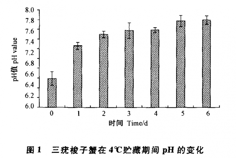 由圖 2可知,TVB-N 含量在貯藏初期變化緩慢,這是由于低溫 (4℃)和真空包裝條 件抑制了蟹肉中微生物的生長和繁殖,導致貯藏前期TVB-N含量增長緩慢 。從貯 藏第 4天開始TVB-N含量顯著上升,含量由34.44mg·100g-1 上升到貯藏第 6 天 的 60.76mg·l00g-1。GB2733—2005 規(guī)定新鮮海蟹的TVB-N含量值應低于 25mg·100g-1,貯藏第 3天蟹肉的TVB-N含量為 22.26mg·100g-1,仍屬于新鮮蟹 肉,貯藏第 4天蟹肉的TVB-N含量高于規(guī)定標準,已腐敗變質(zhì),由此表明 TVB-N 可 以反映蟹肉鮮度的變化 。