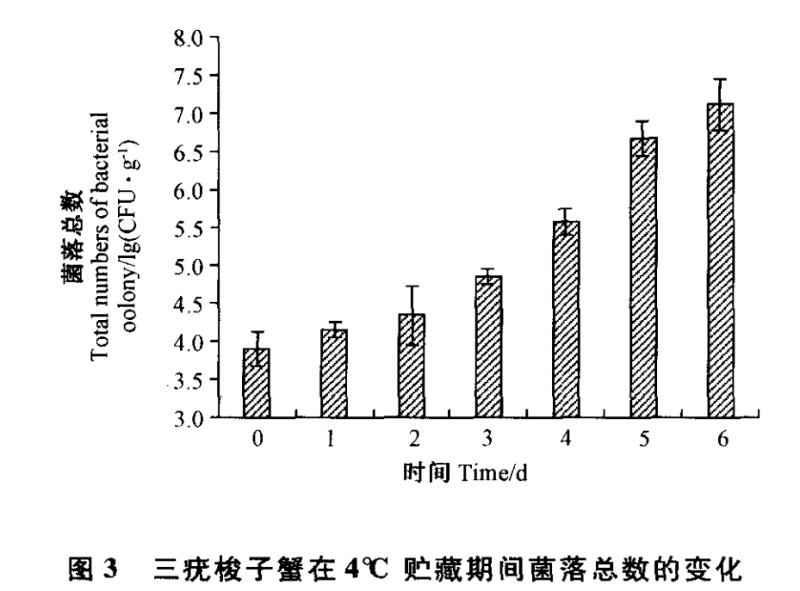 由圖 3可知,貯藏初期菌落總數(shù)較少且變化緩慢,隨貯藏時間的延長,菌落總數(shù)顯 著增長 (P<0.01)。新鮮蟹肉菌落總數(shù)為 3.89lg(CFU·g-1 ),貯藏第3天蟹肉的菌落總數(shù)為 4.84lg(CFU·g-1 ),約為新鮮蟹肉菌落總數(shù)的 10 倍,貯藏第 6天菌落總 數(shù)為 7.11lg(CFU·g-1),約是新鮮蟹肉的 1000 倍,說明貯藏后期蟹肉的營養(yǎng)結(jié)構(gòu) 和環(huán)境條件逐漸適宜細菌的生長繁殖,細菌菌落總數(shù)顯著增多,是導致蟹肉鮮度下降的主要原因。貯藏第 3天是蟹肉微生物菌落總數(shù)的變化節(jié)點,與 TVB-N含量的變化節(jié)點相同且細菌菌落總數(shù)與 TVB—N含量變化趨勢相一致,說明細菌菌落總數(shù)與TVB-N含量顯著相關(guān) 。