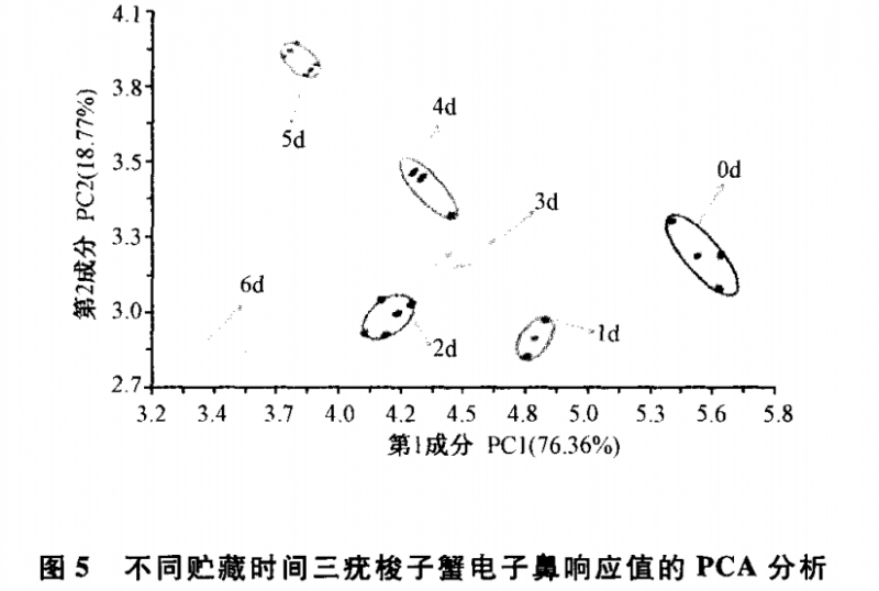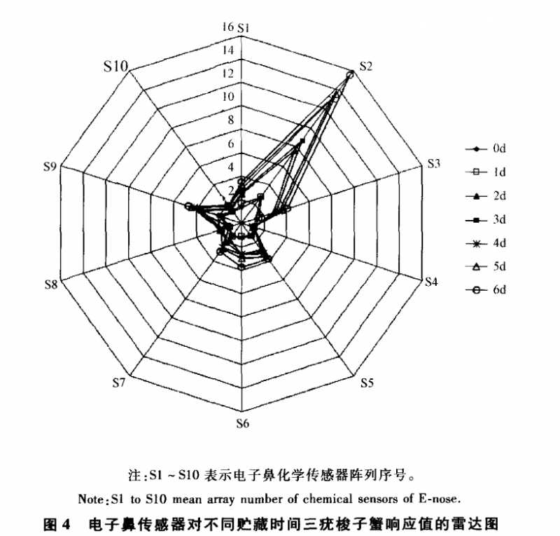電子鼻傳感器陣列由10種金屬氧化物半導體型化學傳感元件組成,每型傳感元件所對應的主要敏感物質(zhì)類型有一定的區(qū)別:s1一芳香成分;s2一氮氧化合物;s3一氨氣;S4一氫氣;s5一烷烴芳香成分;s6一甲烷;s7一硫化物;S8一乙醇;s9一有機硫化物;S10一長鏈烷烴。由圖 4可知,s2、s3、s5、s9號傳感器的響應值較高 ,s4、s8、S10號傳感器響應值較小,表明蟹肉在貯藏過程中主要產(chǎn)生氮氧化合物 、氨氣、烷烴類芳香成分和含硫化合物等揮發(fā)性物質(zhì)。蟹肉中的含氮物質(zhì)和其它一些含硫蛋白質(zhì)在微生物和自溶酶的作用下分解產(chǎn)生大量的含氮化合物、氨氣和含硫化合物,使得蟹肉產(chǎn)不愉快的氣味。對傳感器的響應值進行組間差異性分析,表明 s1、s2、s3、S5、s6、s7、S9、SI0 號傳感器組間差異極顯著 (P<0.01),且 s2、s6、s9號傳感器的響應值均隨貯藏時間的延長不斷增大,s4、s8號傳感器組 問差異不顯著 (P>0.05)。表明蟹肉貯藏過程中氮氧化合物、氨、烷烴芳香成分 、甲烷、硫化物、有機硫化物的氣味差異顯著,氫氣 、乙醇的氣味差異不顯著。