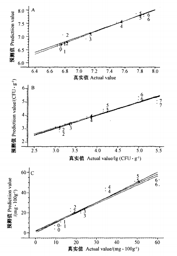 pH值、TVB-N 含量、細菌菌落總數(shù)建立預測模型的主因子數(shù)分別是 5、4、2。由圖 8可知,3個預測模型的校正決定系數(shù) R 均大于 0.900,預測決定系數(shù) R 均大于 0.870,表明電子鼻傳感器響應值與 pH值、TVB-N含量、細菌菌落總數(shù)的相關(guān)性較好。經(jīng)統(tǒng)計學分析可知,pH 值的 RPD 值是 2.73,TVB-N 含量的RPD值是 2.50,細菌菌落總數(shù)的 RPD值是 3.06,說明該預測模型對于細菌菌落總數(shù)的預測精度高,穩(wěn)定性好;pH值和 TVB-N的 RPD值在 2.5~3之間,說明該預測模型是可行的,但預測精度需進一步提高。