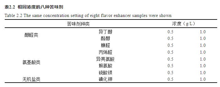 單一苦味物質(zhì)濃度:按表2.1和2.2所列的濃度,準確稱取不同量的8種苦味物質(zhì),于蒸餾水中攪拌溶解,待全部溶解后,轉(zhuǎn)移至100 mL的容量瓶中,定容,配制成表中所示的濃度,備用。