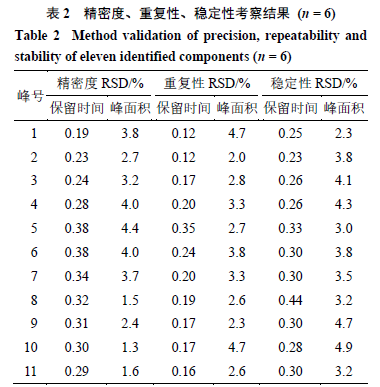 2.5.3 穩(wěn)定性試驗(yàn) 按“2.3”項(xiàng)下方法制備1批供試品粉末,分別于0、2、4、8、12、24 h進(jìn)樣分析。結(jié)果(表2)表明,11個(gè)色譜峰的保留時(shí)間和峰面積的RSD最大值分別為0.44%、4.9%,表明樣品在24 h內(nèi)穩(wěn)定性良好。