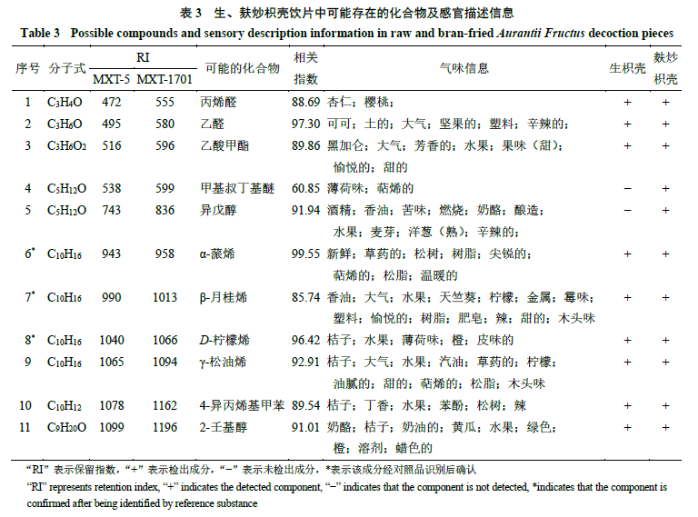 2.6.4 生、麩炒枳殼飲片氣味差異標(biāo)志物分析 將生、麩炒枳殼飲片在超快速氣相電子鼻色譜柱上采集到的色譜峰與Arochembase數(shù)據(jù)庫(kù)進(jìn)行匹配分析,結(jié)果共鑒定出11個(gè)主要?dú)馕痘瘜W(xué)成分,其中生枳殼飲片中有9個(gè)氣味化學(xué)成分,與麩炒枳殼相比,缺少甲基叔丁基醚、異戊醇2個(gè)成分。生、麩炒枳殼中可能存在的化合物及感官描述信息見表3。進(jìn)一步分析已鑒定出的可能化合物氣味信息發(fā)現(xiàn),β-月桂烯、D-檸檬烯、γ-松油烯、4-異丙烯基甲苯、2-壬基醇具有“桔子、橙、檸檬”的味道,而桔子、橙、檸檬均為蕓香科柑橘屬植物,果皮均含有豐富的揮發(fā)油,β-月桂烯、D-檸檬烯和γ-松油烯為單萜類化合物,是揮發(fā)油的組成成分,具有特殊香氣,且D-檸檬烯主要存在于柑橘類植物中[18];本研究用枳殼飲片來源于蕓香科柑橘屬植物,表明已鑒定出的成分與枳殼含有的成分有較好的一致性。