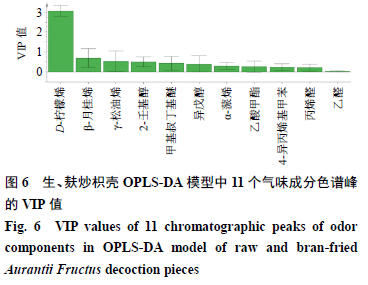 在得到生、麩炒枳殼飲片氣味成分信息的基礎(chǔ)上,為進(jìn)一步分析得出氣味差異標(biāo)志物,以11個(gè)氣味成分所對(duì)應(yīng)的色譜峰峰面積為變量,采用SIMCA 14.1軟件建立生、麩炒枳殼OPLS-DA模型,分析得到11個(gè)成分的VIP值,結(jié)果見圖6。VIP值越大,表明該成分對(duì)區(qū)分生、麩炒枳殼飲片的貢獻(xiàn)越大。由圖6可知,對(duì)區(qū)分生、麩炒枳殼飲片貢獻(xiàn)較大的前3個(gè)成分是D-檸檬烯、β-月桂烯和γ-松油烯,且這3個(gè)成分也是多數(shù)學(xué)者研究[19-20]有報(bào)道的枳殼揮發(fā)油組成成分,結(jié)合枳殼麩炒前后揮發(fā)性成分含量變化情況,初步推測(cè)這3個(gè)成分為區(qū)分生、麩炒枳殼飲片的氣味差異標(biāo)志物。