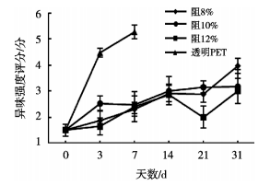 利用人工感官與智能儀器電子鼻相結(jié)合的方式,對光照條件下不同PET瓶裝鮮牛奶風味進行分析。由感官評價可知:透明PET瓶在3d時,整體喜好度平均值低于5分,異味、氧化味強度顯著強于添加不同質(zhì)量分數(shù)的阻光色油PET瓶,而不同質(zhì)量分數(shù)的阻光色油PET瓶樣品在超出保質(zhì)期的31d時喜好度平均值均高于5分,在一定程度上延長了鮮牛奶的保質(zhì)期。由樣品間距離分析可知,透明PET瓶與不同質(zhì)量分數(shù)的阻光色油PET瓶在各時間點均存在較大差異,不同質(zhì)量分數(shù)的阻光色油PET瓶之間無差異。對差異性物質(zhì)進行定性及含量分析,結(jié)果顯示:隨著光照時間的增加,三甲胺、2-丙醇、戊醛、2-甲基丁醛、二甲基二硫、苯甲醛和己酸的含量隨之增多,其中,2-甲基丁醛、二甲基二硫、苯甲醛和己酸僅在未避光的透明PET瓶樣品中出現(xiàn),表明光照對鮮牛奶風味的影響顯著,在不同質(zhì)量分數(shù)PET阻隔瓶中,8%的PET阻隔瓶亦可有效保護鮮牛奶的風味,阻光色油質(zhì)量分數(shù)相差4%左右對產(chǎn)品風味影響不大。、