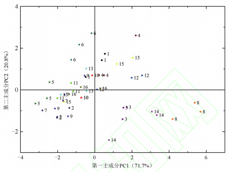 圖2是基于山櫻花香氣的電子鼻數(shù)據(jù)(W1C、W5S、W1S、W1W、W2W和W3S傳感器響應(yīng)值G/G0)構(gòu)建的主成分分析圖(PCA)。第一主成分PC1的貢獻(xiàn)率為71.7%,第二主成分PC2的貢獻(xiàn)率為20.8%,總貢獻(xiàn)率達(dá)到92.5%,說明第一、第二主成分能很好地反映供試樣品的整體信息。從圖2可以看出,3、6、8和14號(hào)處理組合與其他處理組合的樣本點(diǎn)沒有重疊,由此可以區(qū)分出3、6、8和14號(hào)處理。結(jié)合圖1可知8號(hào)處理各傳感器的響應(yīng)值顯著高于其他處理,且與其他處理差異極顯著。因此,8號(hào)處理,即A2B4C3D2處理組合(在12:00采集盛開時(shí)期的櫻花花朵4g,在頂空平衡30min后進(jìn)行電子鼻測(cè)定)的表現(xiàn)最優(yōu),為電子鼻快速測(cè)定櫻花香氣的最優(yōu)組合。