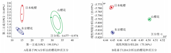 采用PCA和LDA法對(duì)3種櫻花進(jìn)行分析(圖3),從圖3可以看出,不同種櫻花的樣本點(diǎn)沒有重疊,每種櫻花樣本點(diǎn)均有特定的分布區(qū)域。PCA結(jié)果顯示第一主成分PC1的貢獻(xiàn)率為99.33%,第二主成分PC2的貢獻(xiàn)率為0.49%,這兩個(gè)主要成分解釋了總方差的99.82%(圖3A),不同種質(zhì)區(qū)分度達(dá)到0.677~0.974。從LDA分析結(jié)果可以看出(圖3B),判別式LD1和判別式LD2的貢獻(xiàn)率分別為75.30%和23.95%,總貢獻(xiàn)率達(dá)到99.25%,稍低于PCA的總貢獻(xiàn)率(99.82%),但不同種質(zhì)區(qū)分度為1高于PCA分析的區(qū)分度,并且從LDA分析圖中發(fā)現(xiàn),每種櫻花樣本點(diǎn)相比于PCA樣本點(diǎn)更為集中。