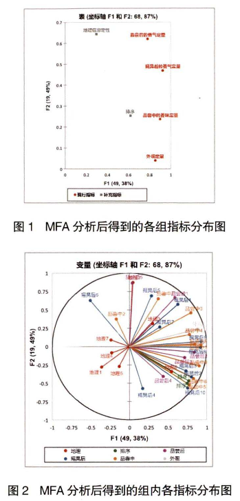 He等在報(bào)道中對腐乳進(jìn)行了多維度分析,包括由兩種感官分析方法獲得的感官數(shù)據(jù)(0DA和FP)、GC-MS靶標(biāo)揮發(fā)性化合物分析及物理性質(zhì)分析,MFA 在該文中被用于解釋這3類指標(biāo)之間的關(guān)系及物理化學(xué)指標(biāo)對感官的貢獻(xiàn)。陸龍建等運(yùn)用 MFA法對分類化學(xué)成分與感官評價(jià)結(jié)果進(jìn)行了綜合分析,并比較了采用化學(xué)成分和感官評價(jià)兩種方法剖析卷煙風(fēng)格特征時(shí)的一致性。