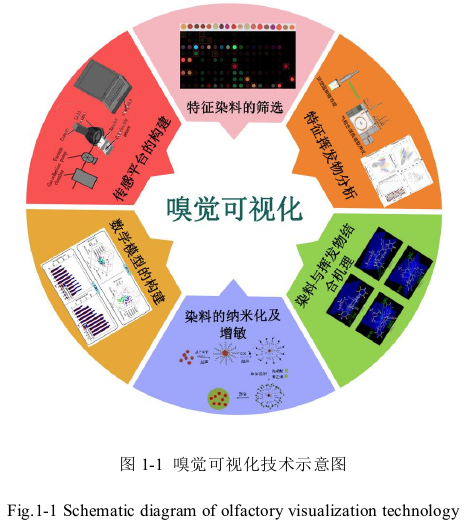 嗅覺可視化技術(shù)本質(zhì)上是一種新型的電子鼻技術(shù),于2000年由美國伊利諾伊州立大學(xué)的NealA.Rakow教授和KennethS.Suslick教授首次提出。這項(xiàng)技術(shù)主要依賴于各種化學(xué)染料組成的可視化傳感器陣列對(duì)樣品中揮發(fā)性氣體的化學(xué)響應(yīng)。這些化學(xué)染料通過分子間的相互作用(π-π鍵和金屬鍵的作用、酸堿相互作用以及電荷轉(zhuǎn)移等)來與氣體中的小分子結(jié)合,并且必須具備兩個(gè)條件:(1)染料中必須存在一個(gè)與氣體中小分子強(qiáng)相互作用的中心;(2)染料在接觸小分子氣體時(shí)會(huì)發(fā)生顏色變化。
