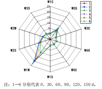 圖3 不同貯藏期電子鼻傳感器響應值雷達圖