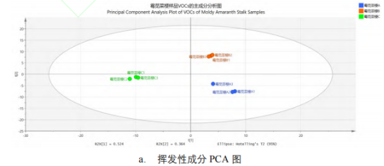 由圖4-b所示,VIP>1的化合物有75種,其中OAV≥10000的成分有2種,有己酸乙酯和芳樟醇,貢獻(xiàn)水果和薰衣草氣味。正庚醇在產(chǎn)品B中含量達(dá)到1.88g/L,貢獻(xiàn)刺激性氣味,并且它的VIP>1、OAV≥1且含量較高。因此,正庚醇、己酸乙酯和芳樟醇是霉莧菜梗的重要差異物,這和霉莧菜梗含量差異結(jié)果、OAV分析結(jié)果一致,正庚醇、己酸乙酯和芳樟醇在影響傳統(tǒng)發(fā)酵霉莧菜梗的風(fēng)味方面具有重要作用。利用PCA和OPLS-DA可變投影VIP值分析能分析出差異性物質(zhì),這些差異性物質(zhì)有可能是傳統(tǒng)發(fā)酵霉莧菜梗的獨(dú)特風(fēng)味。