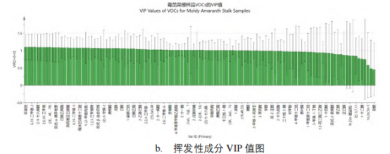 OPLS-DA是一種用于樣品判別分析的統(tǒng)計(jì)方法,有助于從大量代謝組學(xué)數(shù)據(jù)庫中篩選出差異性代謝物。OPLS-DA模型利用可變投影影響(VIP)評分來識別霉莧菜梗中的差異風(fēng)味物質(zhì),VIP>1的物質(zhì)是樣品中的差異代謝物。