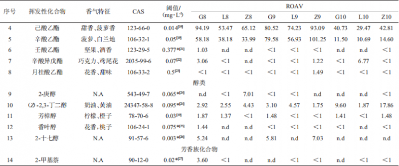 不同產(chǎn)地同一采收時間火龍果的發(fā)酵酒樣品中的揮發(fā)性風(fēng)味成分種類數(shù)多少排序為樣品G8(54)>L8(49)>Z8(40),樣品G9(53)>Z9(49)>L9(48),樣品L10(44)>Z10(40)>G10(39)。