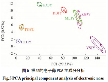 結(jié)合 PCA 貢獻(xiàn)率分析(根據(jù)電子鼻軟件內(nèi)部的計(jì)算方式得到,數(shù)值越接近于1說(shuō)明樣品的區(qū)分越顯著),由圖可見(jiàn),HTHY 和 TGYL 兩個(gè)樣品與其余5個(gè)樣品之間的氣味差異明顯。5個(gè)JY樣品之間也存在明顯的氣味差異,其中KBJY和MLJY二者在氣味上非常接近;其余三者在圖中的落點(diǎn)也沒(méi)有重疊或者堆積在一處,可見(jiàn)氣味并不相似。