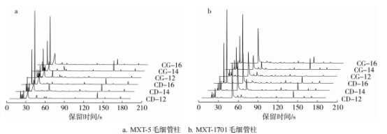 對(duì)充氮和常規(guī)包裝的醇化片煙樣品進(jìn)行快速氣相電子鼻分析,得到2根不同極性色譜柱對(duì)應(yīng)的揮發(fā)性成分指紋圖譜,結(jié)果如圖3所示??梢钥闯?,不同包裝片煙的色譜峰在52~68個(gè)之間,其峰面積也不相同,說(shuō)明樣品揮發(fā)性成分種類和含量存在一定差異。且不同醇化時(shí)間下,同一包裝片煙的揮發(fā)性成分種類和含量也有明顯差別。