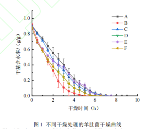 不同熱風(fēng)干燥方法對羊肚菌含水率動(dòng)態(tài)影響如圖1所示。由圖1可知,干燥速率B處理>F處理>D處理>C處理>E處理>A處理,A處理起始干燥溫度低,為35℃,羊肚菌干燥速度最慢,表明干燥溫度是影響干燥過程的主要因素之一,可見間歇處理會(huì)使羊肚菌子實(shí)體表面水分散失減緩,延長干燥時(shí)間。