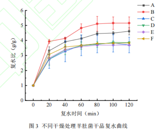 不同干燥方法下的羊肚菌干品復(fù)水曲線如圖3所示。各處理組的復(fù)水比在80min后復(fù)水比趨于平穩(wěn),B處理羊肚菌復(fù)水比最高,A處理次之,明顯優(yōu)于其他處理組。